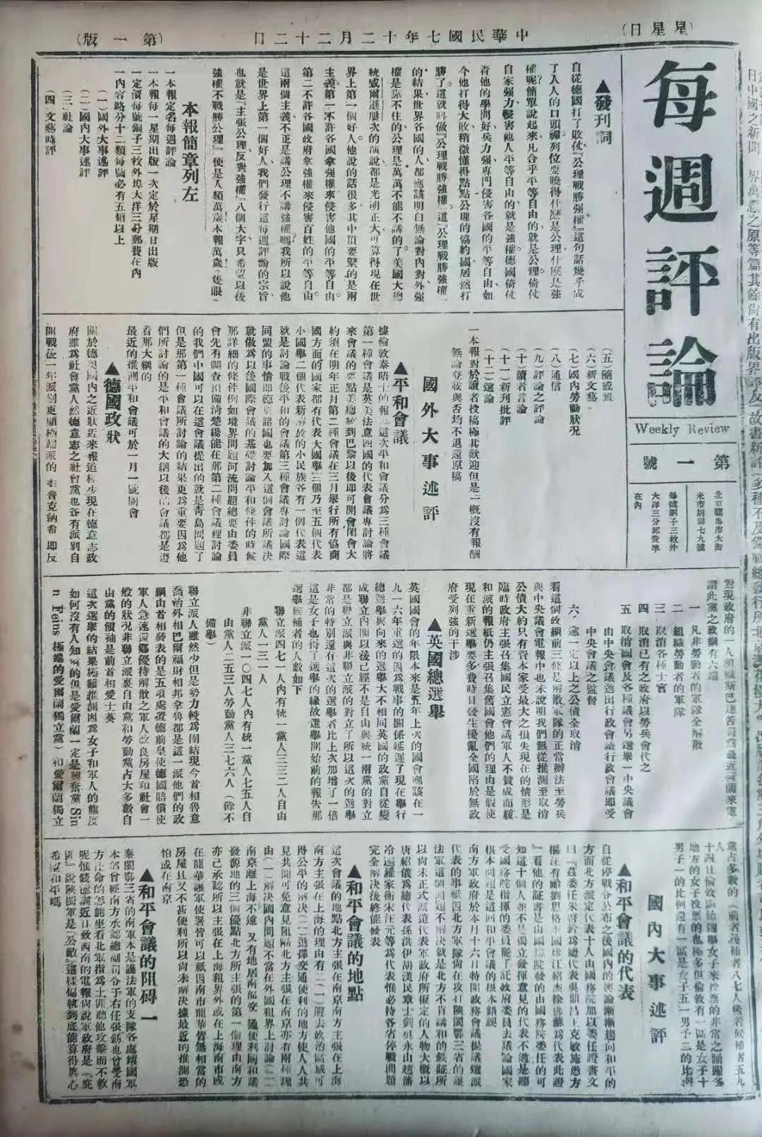 《每周评论》于1918年12月22日在北大红楼二层文科学长室创刊,它聚集了以陈独秀、李大钊、胡适等新一代知识分子的时事论述。刊物内容以反映当前迫切的政治问题为主,与《新青年》侧重理论的特点互补充,在当时具有很大的影响。其中,它开设“名著”栏目刊登《共产党宣言》节译,坚定地传播着马克思主义和共产主义思想,引领开创了短小形式的政评时评类刊物的群星璀璨时代。